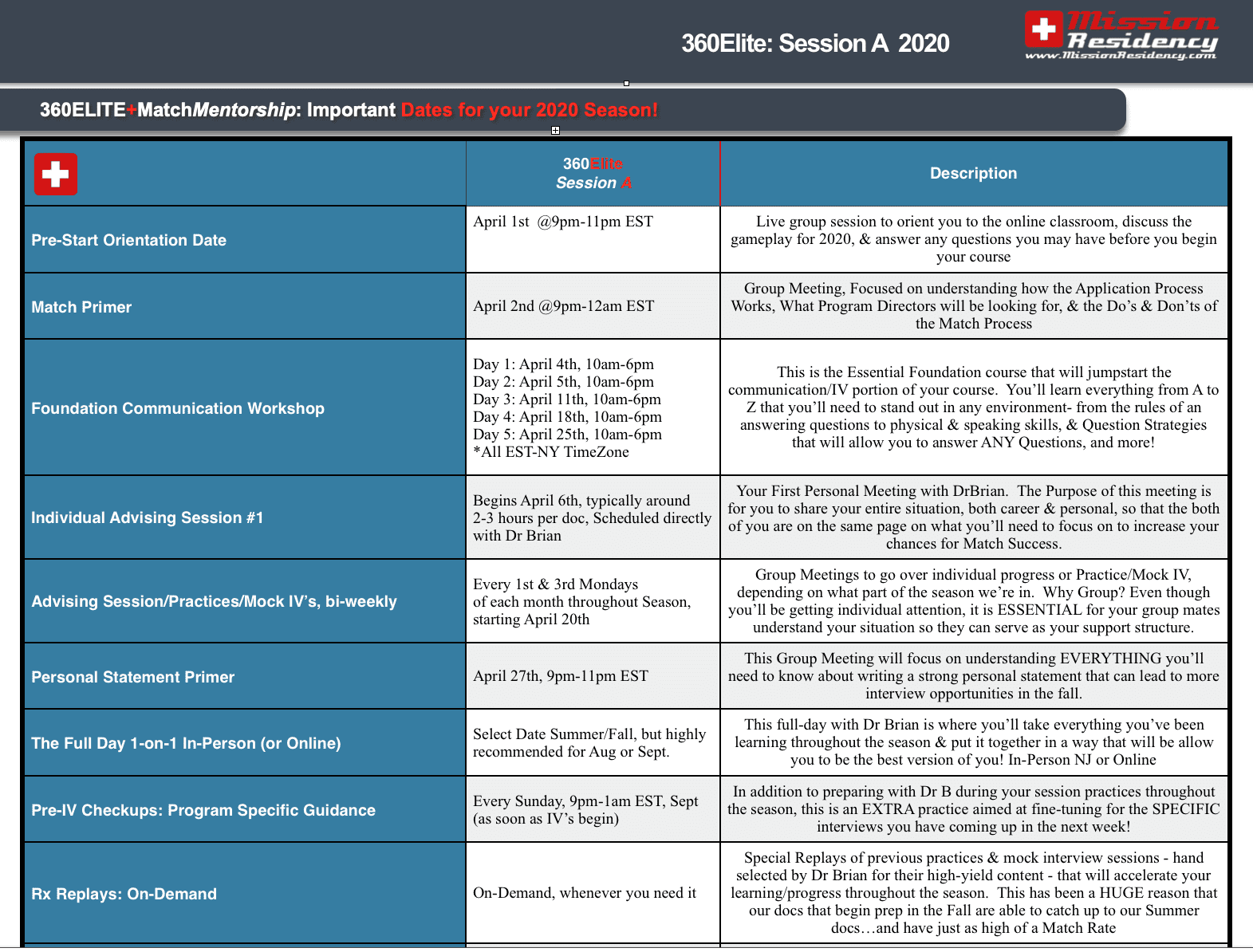 Doctors accepted to our 360Elite Team benefit from the highest level of personal mentorship/guidance that Mission has to offer.  As a 360Elite Member, you’ll work personally with Dr Brian throughout the season to strengthen your CV and your communication skills. This session historically has the highest Match Rate among our Sessions throughout the year.ommunication skills. Â