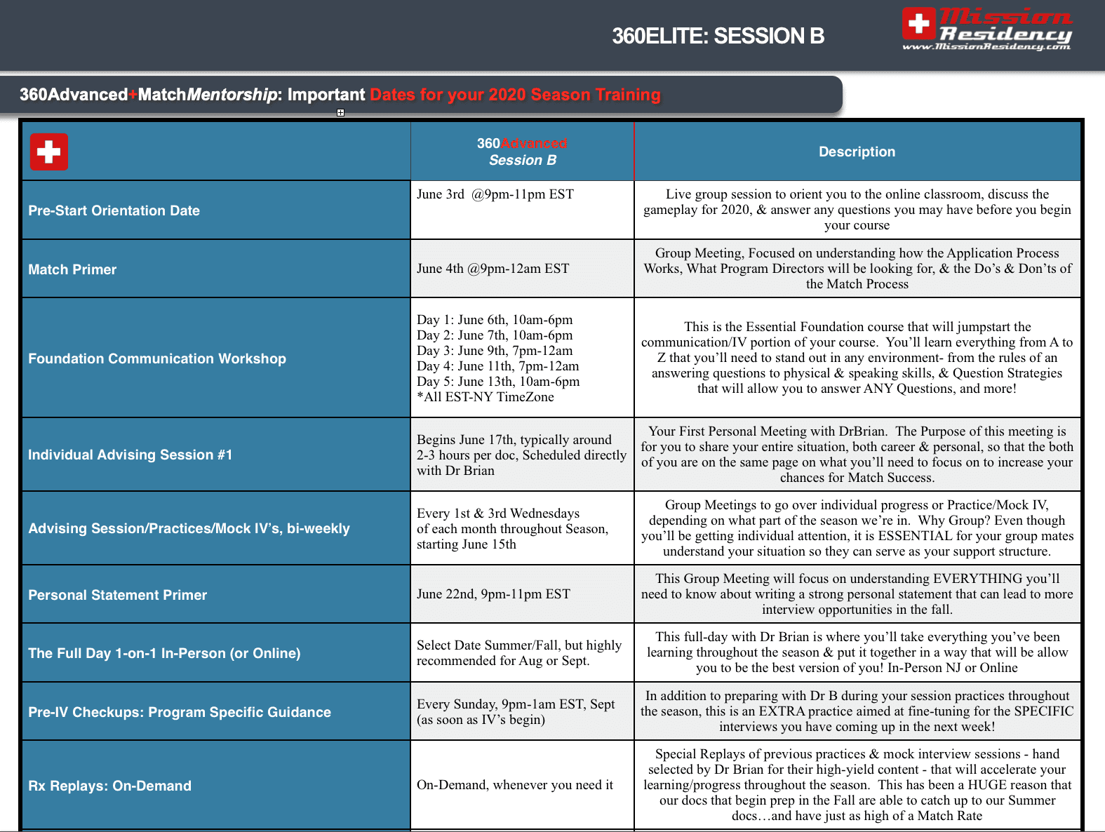 This course is the backbone for Mission Residency’s success & the reason why year after year, our Match Success rate has consistently been in the 86-92% range year after year. It begins with the Foundation IV Prep LIVE Seminar, with training/guidance, mock interviews, pre-interview checkups, and follow-ups all the way until Match Day.